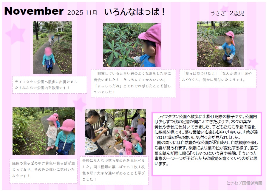 ときわぎ国領保育園は、保育の活動記録として『保育ドキュメンテーション』を取り組んでいます。保育ドキュメンテーションとは、保育の一場面を写真付きで記録する物です。毎日見せてくれる子ども達の愛らしい様子も記録から見えます。