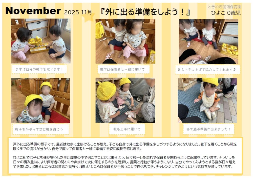 ときわぎ国領保育園は、保育の活動記録として『保育ドキュメンテーション』を取り組んでいます。保育ドキュメンテーションとは、保育の一場面を写真付きで記録する物です。毎日見せてくれる子ども達の愛らしい様子も記録から見えます。