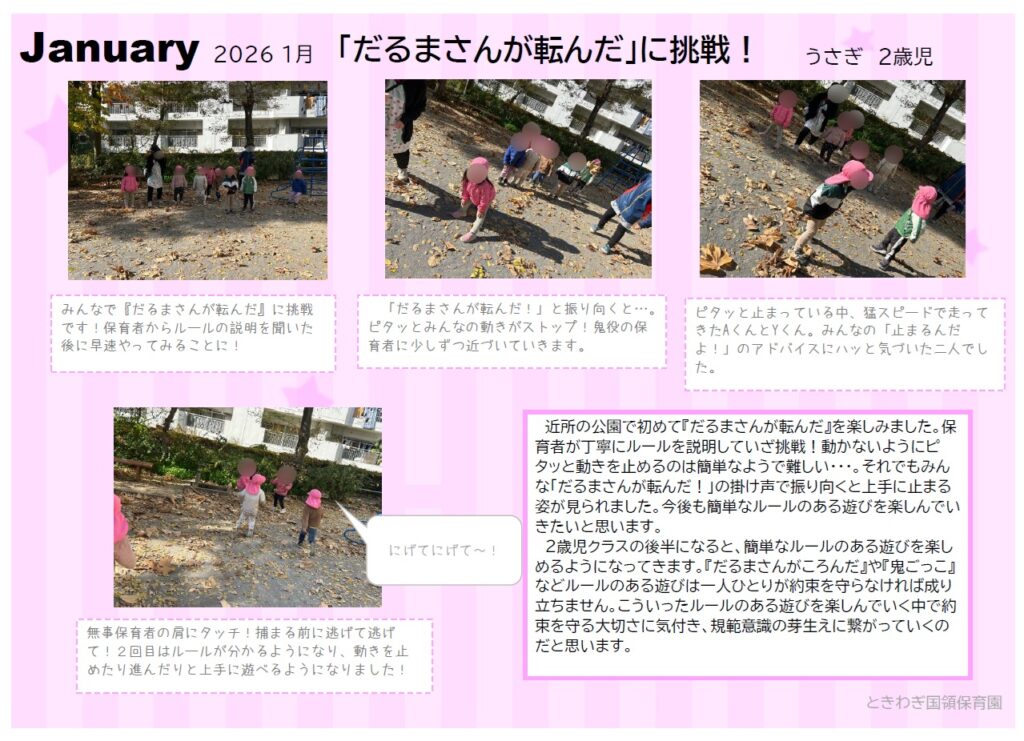 ときわぎ国領保育園は、保育の活動記録として『保育ドキュメンテーション』を取り組んでいます。保育ドキュメンテーションとは、保育の一場面を写真付きで記録する物です。毎日見せてくれる子ども達の愛らしい様子も記録から見えます。
